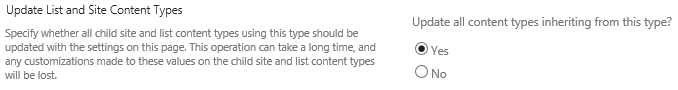 The question was: When I create a content type in the content type hub and publish it, the content type is pushed down to all site collections and there you can use it in your lists and libraries. Now if we change the content type’s title or description and republish it, the changes are pushed down to the level of site collection but not to the content types associated to a list. When we create a new list the changes are visible for that new list.