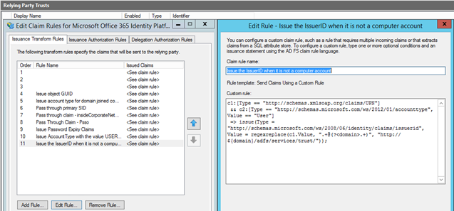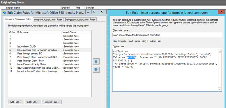 Rule name: “Issue account type for domain joined computers” Rule value: c:[Type == “http://schemas.microsoft.com/ws/2008/06/identity/claims/groupsid", Value =~ “-515$”, Issuer =~ “^(AD AUTHORITY|SELF AUTHORITY|LOCAL AUTHORITY)$”] => issue(Type = “http://schemas.microsoft.com/ws/2012/01/accounttype", Value = “DJ”);