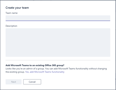 This is possible but you need to keep a few things in mind to have the ability to upgrade a Microsoft Team. So let’s first start at the beginning, creating a Microsoft Team can be done within the Microsoft Team application by clicking on “Create team” and you will get this simple screen to create a new team