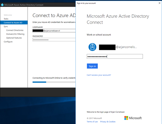 This week I needed to create a demo environment for my presentation at SharePoint Saturday in the Netherlands and I Installed the latest version of Azure Active Directory Connect (1.1.524.0) and to my surprise it supported modern authentication when I connected to Azure Active Directory. I created an account where MFA was disabled to make the connection but that was not necessary to my surprise. See the screenshot below asking Azure Active Directory Connect for sign into my tenant.